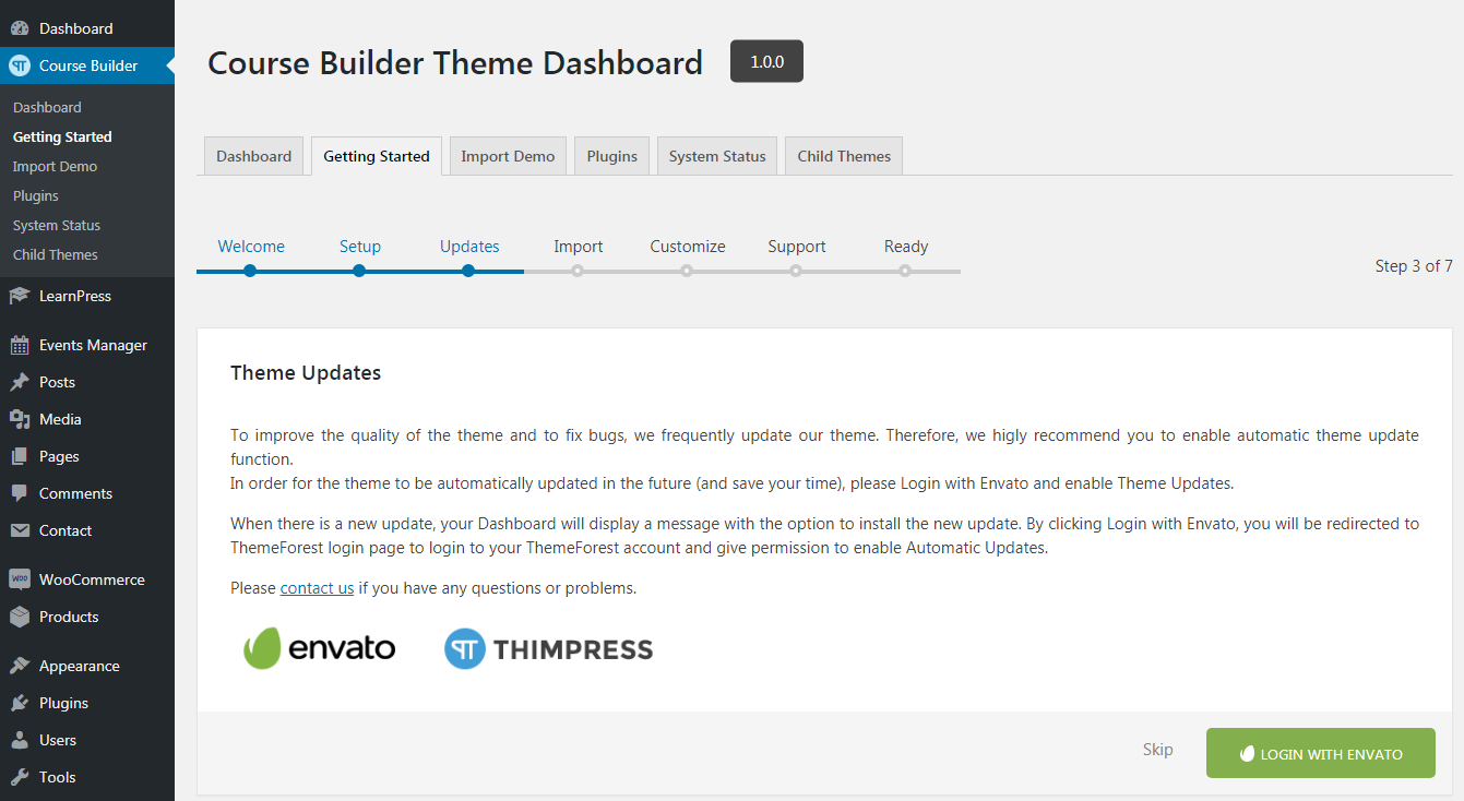 Step 1 – Visit Course Builder > Dashboard and login with your Envato account.