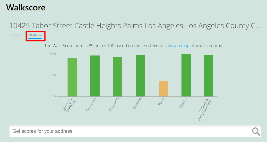 The Walkscore item will be displayed on the single property page, with 2 parts: Scores and Nearby.