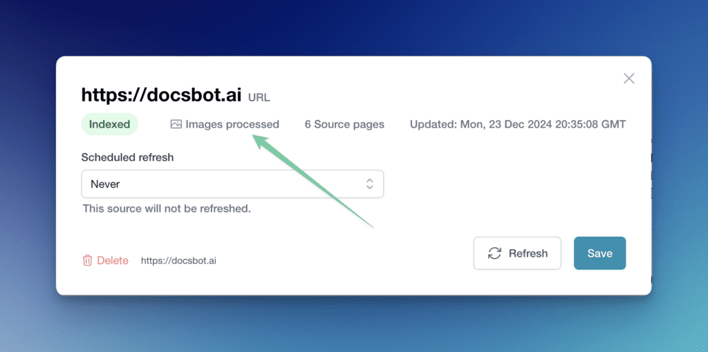 - You can click on any source in your bots and see “Images processed,” to know if that source includes image content or not (whether you selected the checkbox on creation).