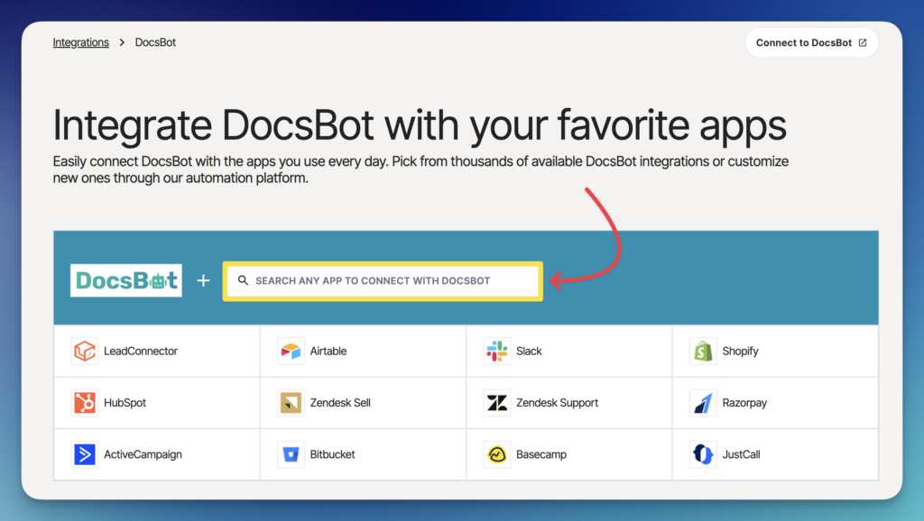 From there, you can connect DocsBot with any of the available apps. viaSocket provides ready-to-use templates to get started quickly, or you can build custom workflows tailored to your needs.