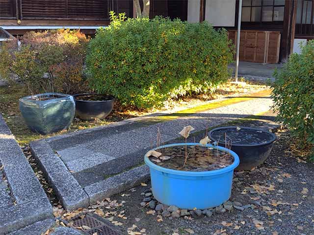 境内を奥へ歩くと、こんな風にいくつか蓮の鉢があります。