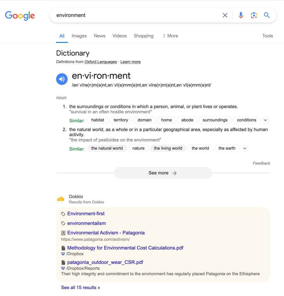 Here’s a screenshot of a search for “environment” in Google, with Dokkio Sidebar connected to our Patagonia demo account. You’ll see that, rather than expanding the side panel, the results are presented in-line with the search engine’s results:
