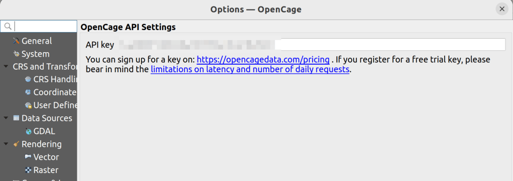 The OpenCage Geocoding plugin is a processing plugin that offers forward and reverse geocoding within QGIS. Being a processing plugin, it benefits from many features out-of-the -box, such as batch/asynchronous processing, integration with the modeller or the ability to run on the python console. It also features a standard UI, with inputs, outputs, options and feedback which should be familiar to processing users.