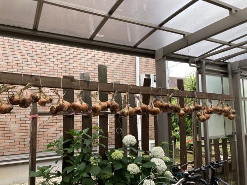 ご近所にお裾分けして、我が家で食べる分のタマネギは、ぶら下げました。