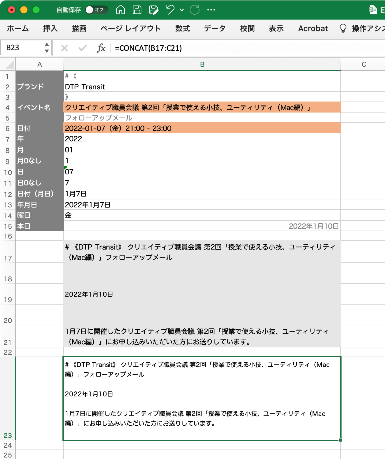 B17からB21までのセルを束ねるのに、CONCAT関数を使うと改行は消えてしまいます。