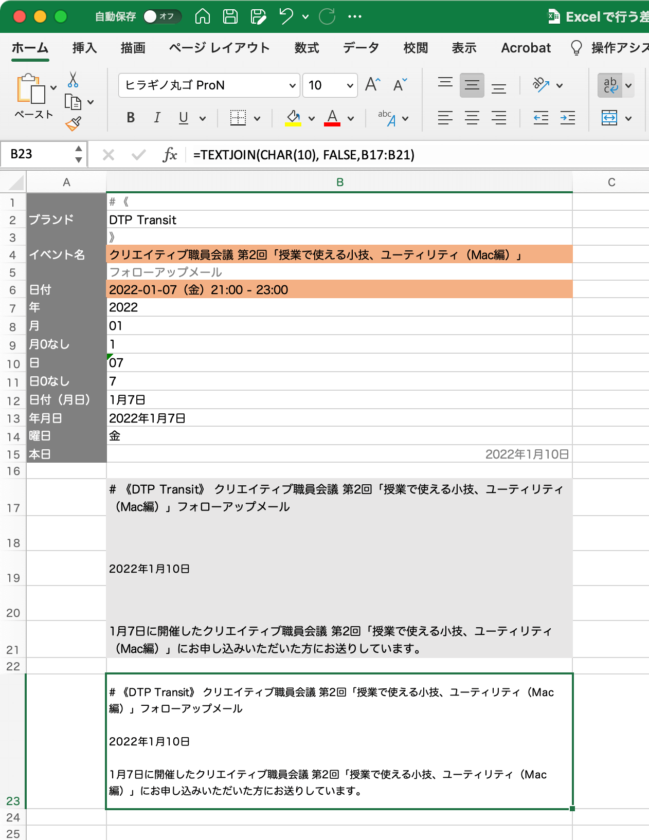 TEXTJOIN関数を使うとスマートに複数セルを束ねられます。この際、空行を空行として扱うために2番目の引数はFALSEに設定します。
