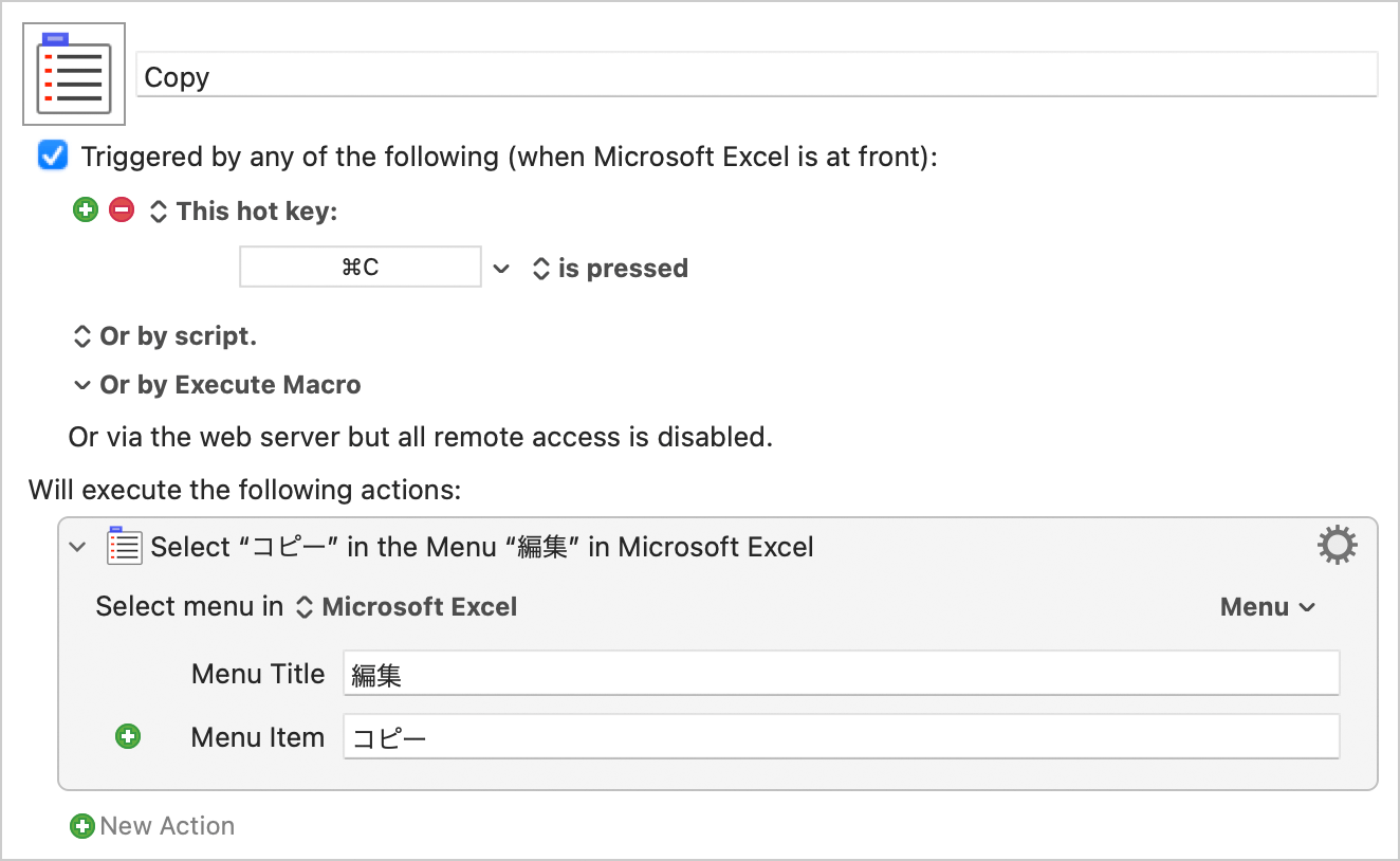 前提条件として、[編集] → [コピー]に対して、⌘ + CをKeyboard Maestroにて設定しておく必要があります