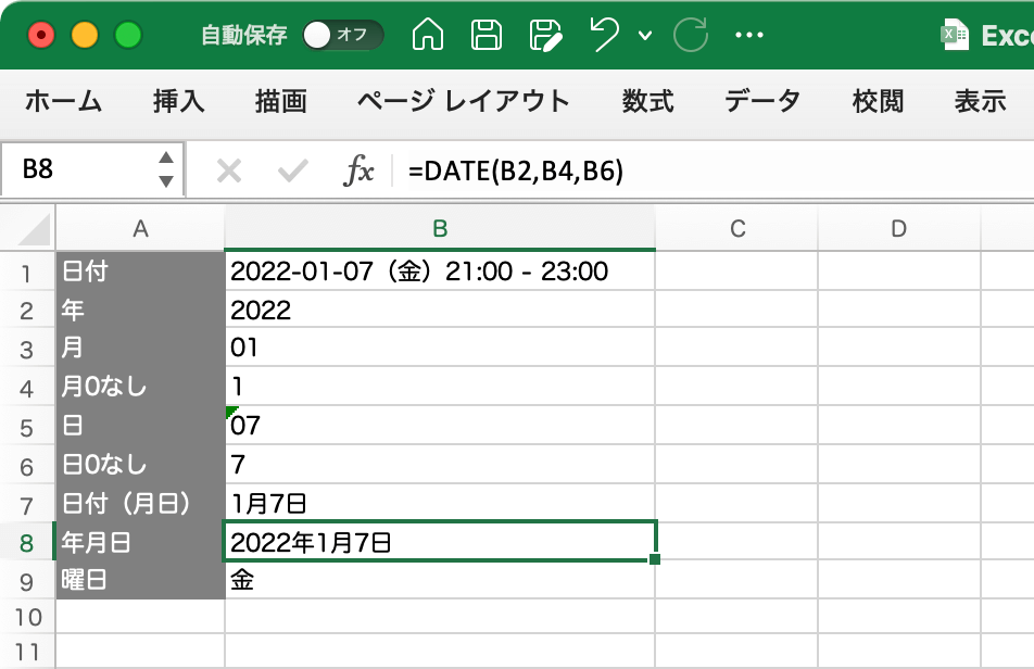 最初にB1から日付の情報に変換してしまう方がスマートかも。