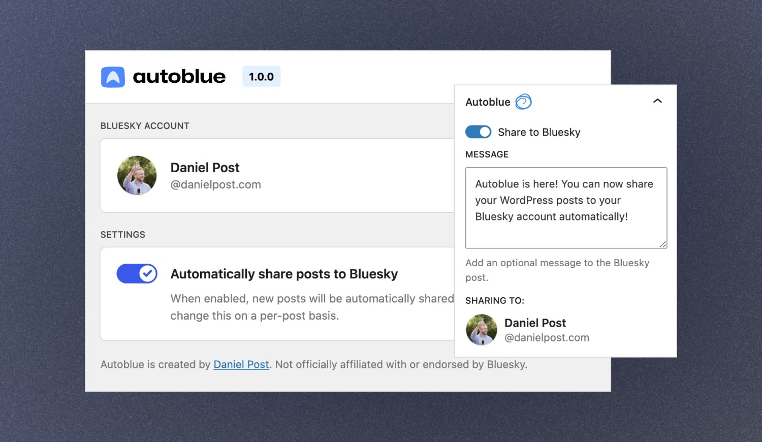 When you share a post, it sends the post title, featured image, and custom message to the Bluesky API.