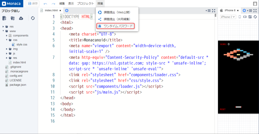 MonacaクラウドIDEのメニューから『授業』メニューを選択して下さい。