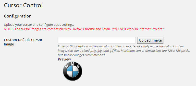 The idea of this plugin is to make a user friendly, easy way for you to be able to upload custom cursor image via the WordPress admin and easily add it to your site. IE requires you to use .cur image files for cursor icons. These files cannot be uploaded via the built-in WordPress media uploader.