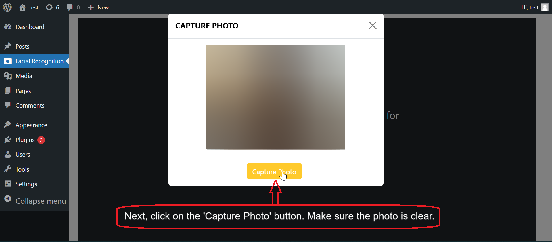 - After completing the registration, log out from the WordPress dashboard. The plugin will then prompt you to authenticate using facial recognition on the login page. Ensure your webcam is enabled.
