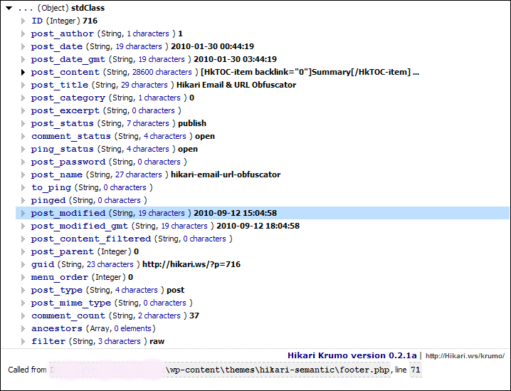 Krumo is also adapted so that it’s configured from a WordPress plugin admin page instead of original krumo.ini, making it much easier to config. You can also configure who should see krumo output, so that you use it in frontend while your visitors see your site without even guessing Krumo is in place there.