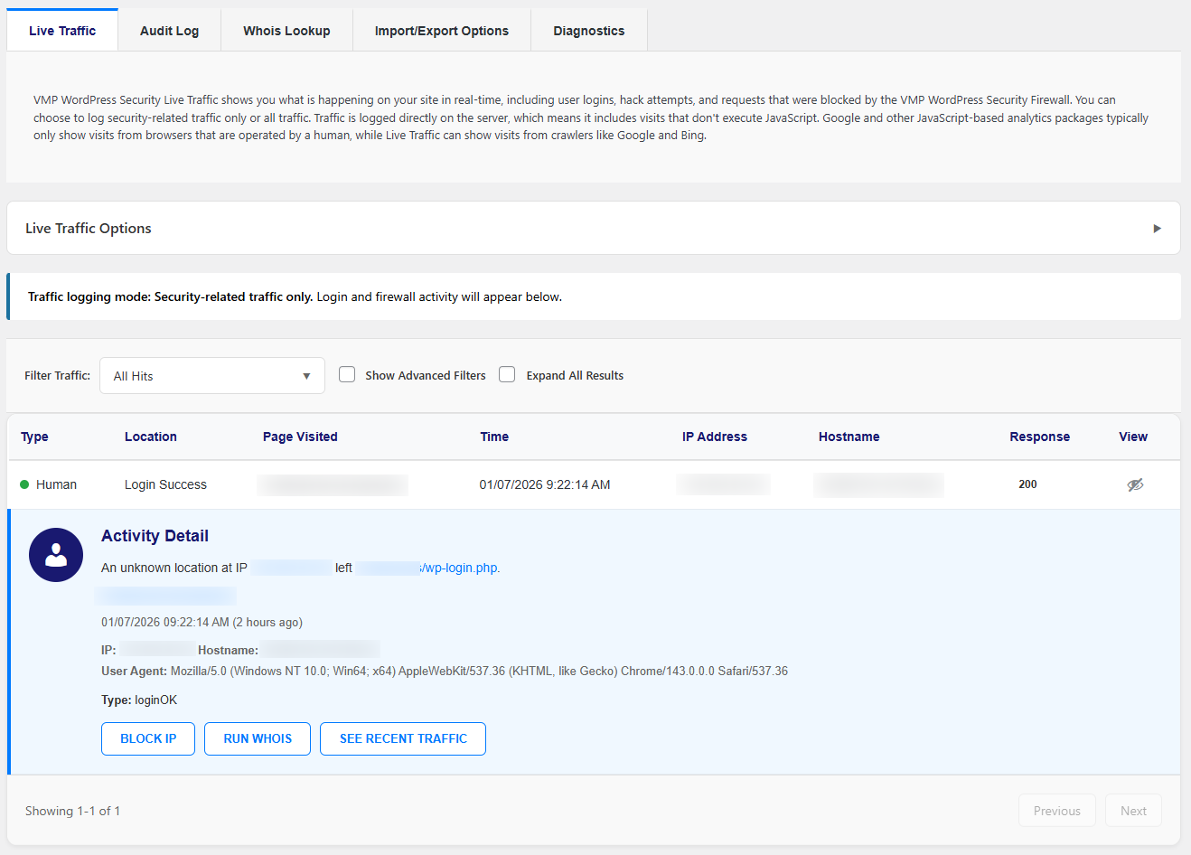 - Detailed Logging – Complete audit trail with IP, country, and request data