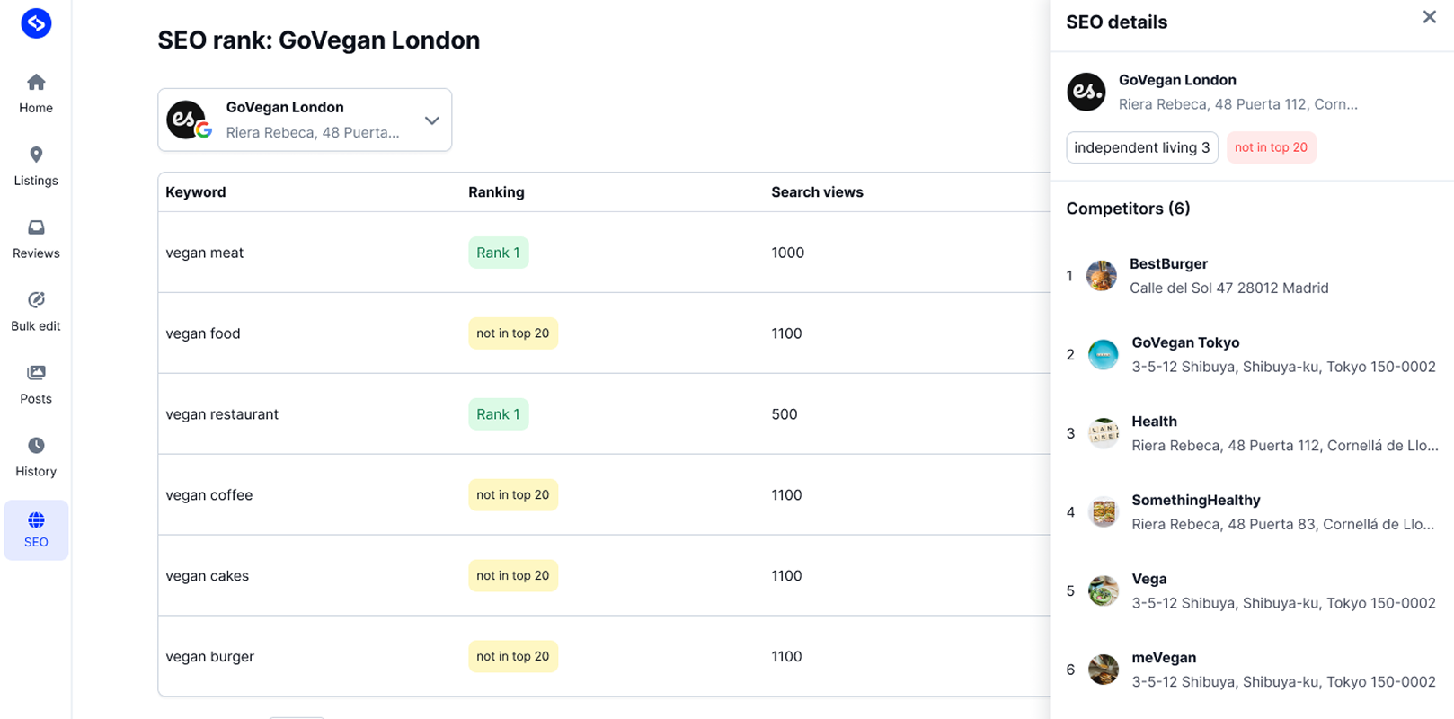Googleマップ上での検索順位を、キーワードごと・地点ごとにトラッキングできます。ユーザーが検索する場所やワードに応じた掲載順位の変動を可視化できるため、MEO施策の効果検証やエリア別の改善に役立ちます。