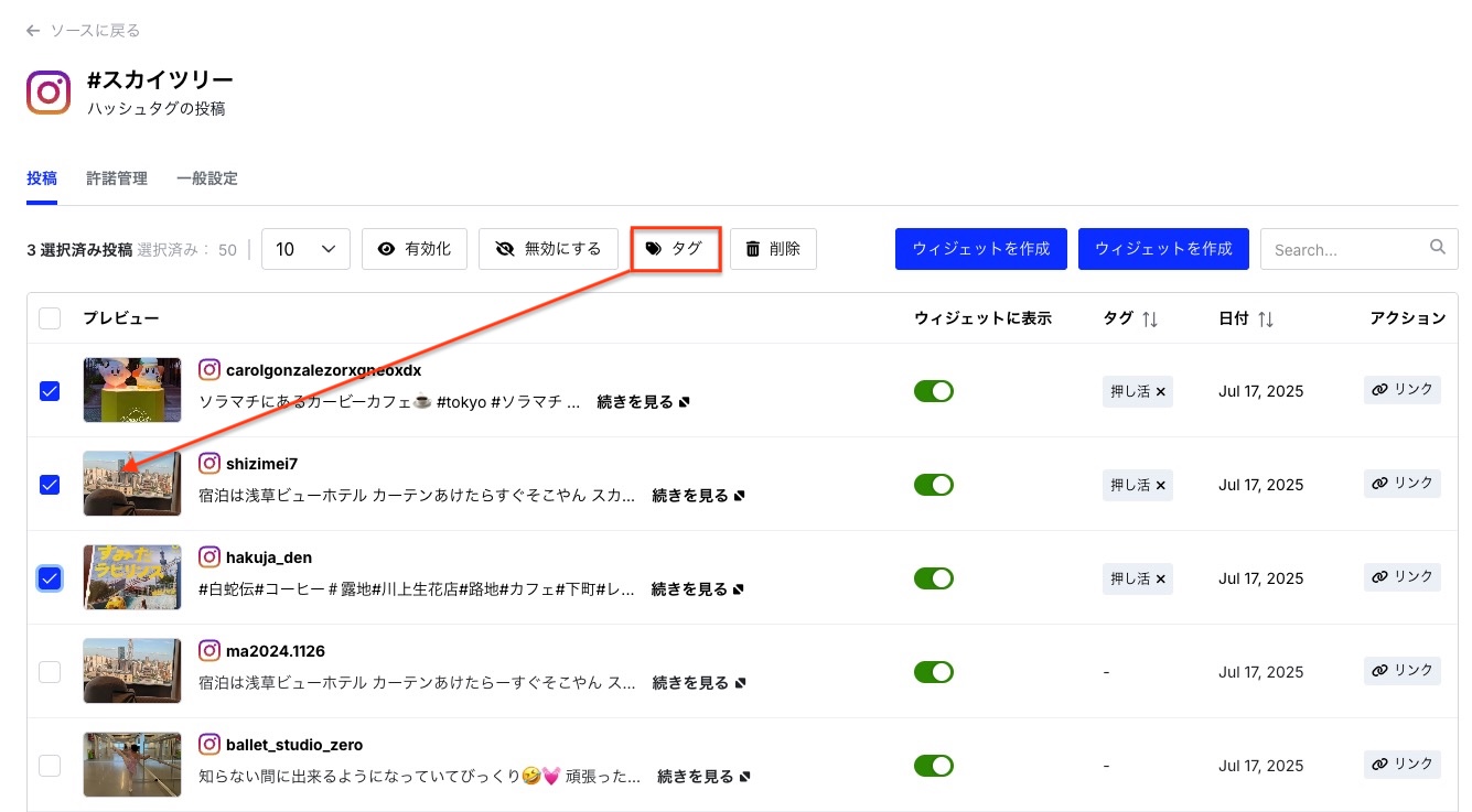 EmbedSocialでは、収集した投稿に対して任意のタグを自由に付けることができます。