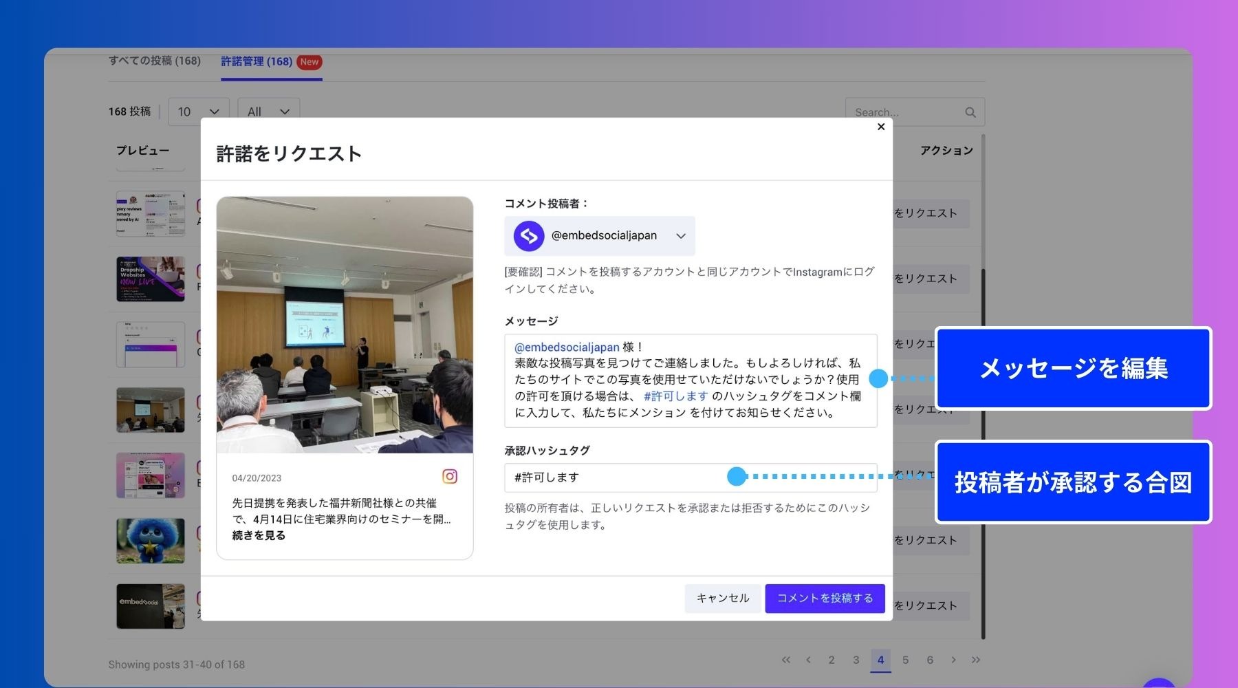 管理画面から使用許諾申請機能を使って、投稿者に対しDMまたはコメントで許諾メッセージを送信できます。投稿者がメッセージに返信すると自動的にステータスが「許諾済み」に更新されるため、進捗管理の手間も軽減されます。
