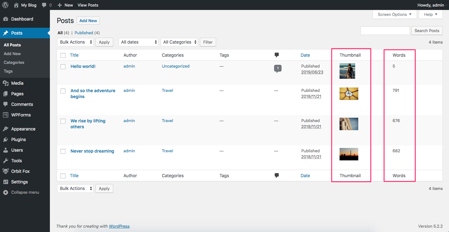 Post Words Count is a simple plugin which shows the total words of a post and thumbnail of the post at All Post section in dashboard. So, you can easily find out the total words of a post and the including or excluding the thumbnail of the post.