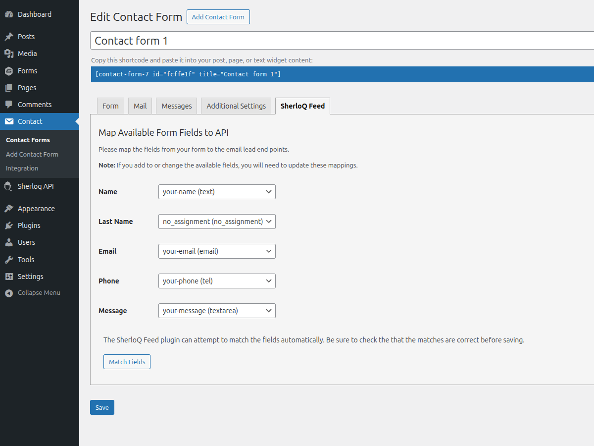- Map the form fields to SherloQ in the Contact Form 7 form’s settings tab.