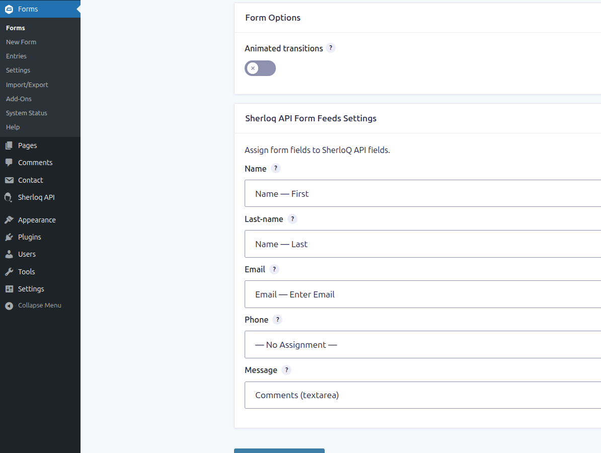 - Configure the forms to work with SherloQ feeds by adding your API username and key to the SherloQ Integration page in the WordPress admin.