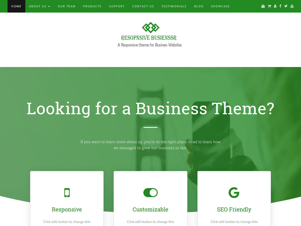 Responsive Businessr is a clean, responsive, SEO friendly and customizable WordPress theme for business websites. it is perfect theme to display business informations such as logo, text, images gallery, portfolio, audio, video, maps, social icons, forms, tables, lists, testimonials, call to action, menu, slider etc. Features: Custom Logo, Header Image, Front Page Slider, One Click Demo Import, Social Profile, Blog Options, WooCommerce Options, Page layouts, Footer Widgets Layout, Full Width Page, Typography Options, Custom Menu, Sidebar Layout, Footer Copyright Section, Translation Ready, Elementor Page Builder ready, Contact Form 7 Ready, WooCommerce Ready and support all popular plugins like WordPress SEO, Akismet, Caching.