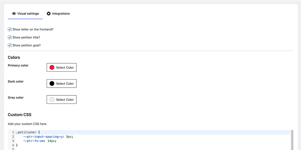 You can customize your petitions under Petitioner -> Settings. You can change the colors, conditionally display certain fields, and add custom CSS.