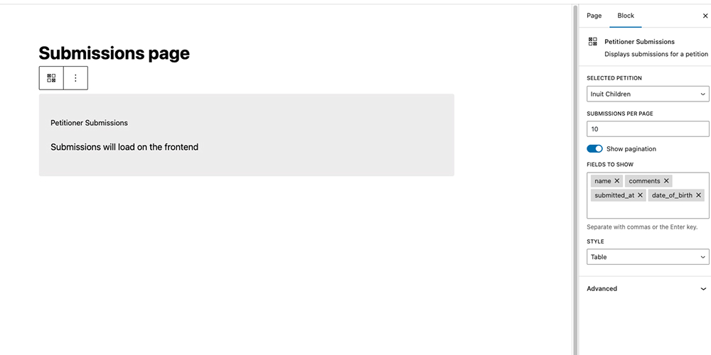 [petitioner_submissions]shortcode wherever you want the signatures to appear. Full walk-through: https://getpetitioner.com/docs/show-submissions-on-the-frontend/ -
