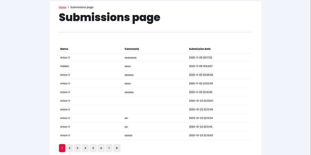 – Submissions display – list, grid, and ticker layouts with privacy controls.