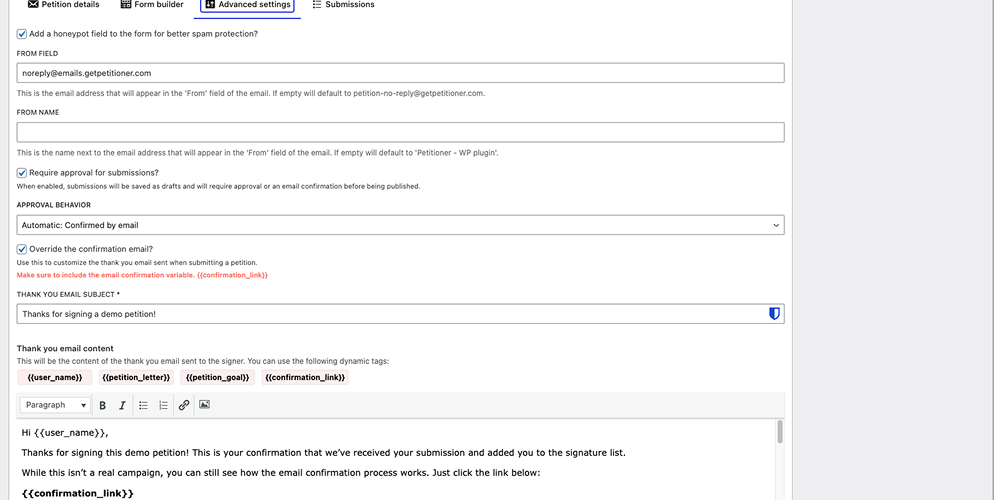 – WYSIWYG editor: Easily edit petition letters and confirmation emails using a modern WYSIWYG editor.
