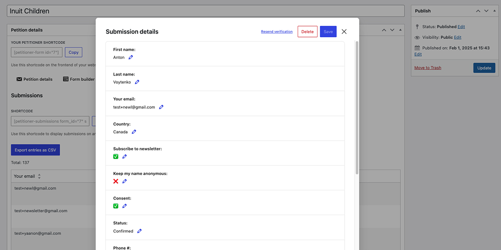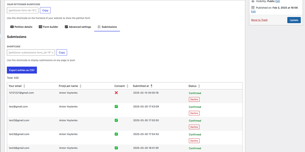 – Form submissions export: Export petition signups and submission data to a CSV file for easy reporting.