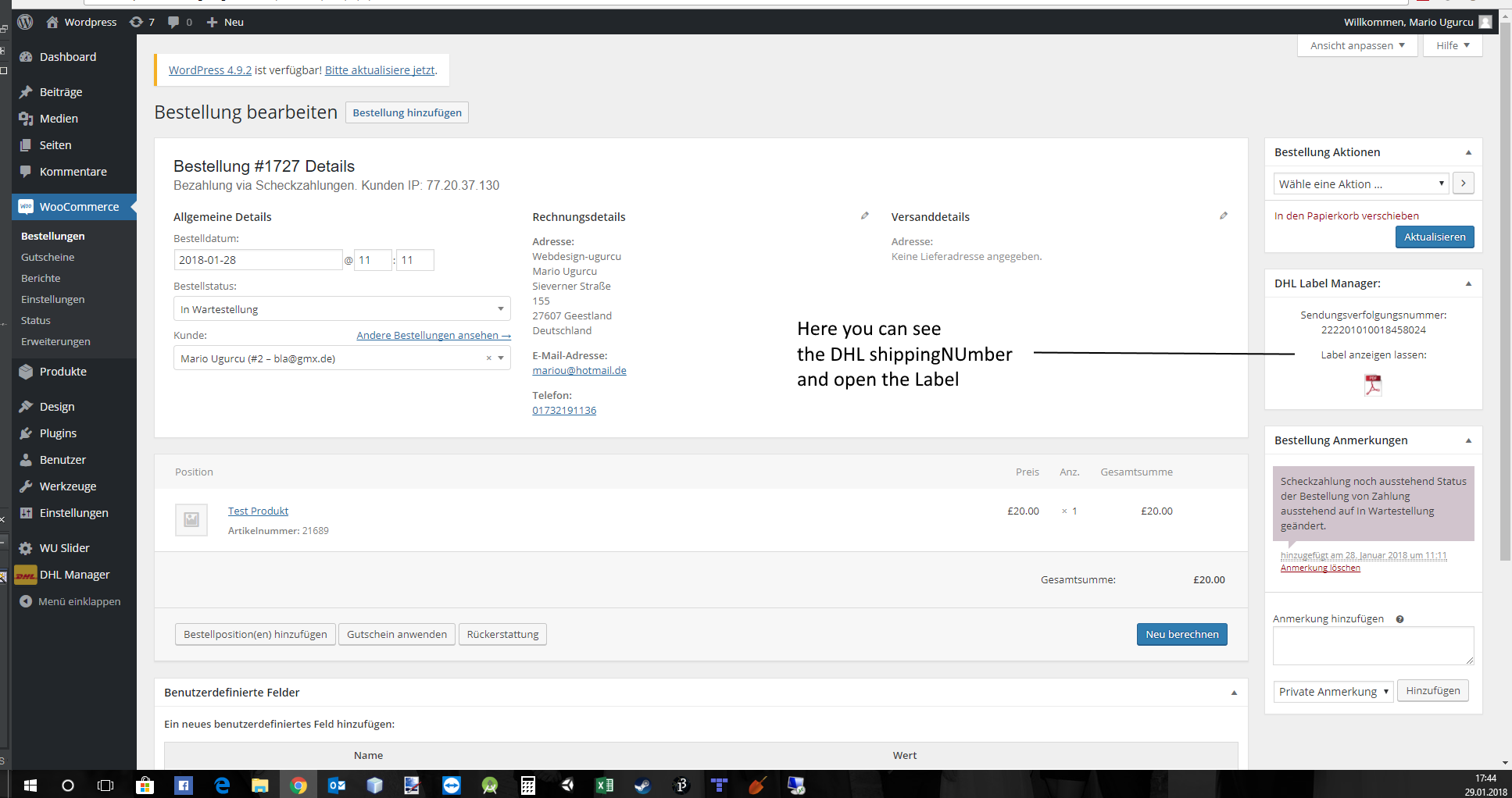 This plugin enables a feature for you to print your DHL shipping labels directly from wordpress. If someone makes a order in your woocommerce shop, you can now create a DHL label at orderDetails