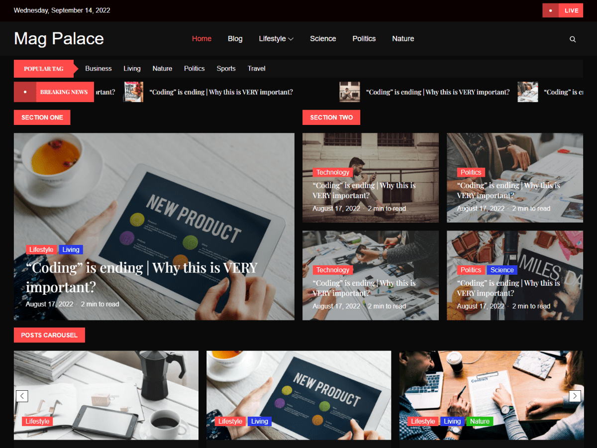 Mag Palace ( Child theme of Magazine Palace ) is based on the WordPress News theme, excellent for the news site. The theme is simple to install, and anyone with little or no programming experience may create a professional-looking website. Thanks to its powerful customization capabilities, you may change the design look by changing the color, adding widgets, and more. It is also fast and responsive. It works and looks well from the reader’s perspective. Users can easily access the news from mobile devices, laptops, or any device regardless of their sizes and browsers.