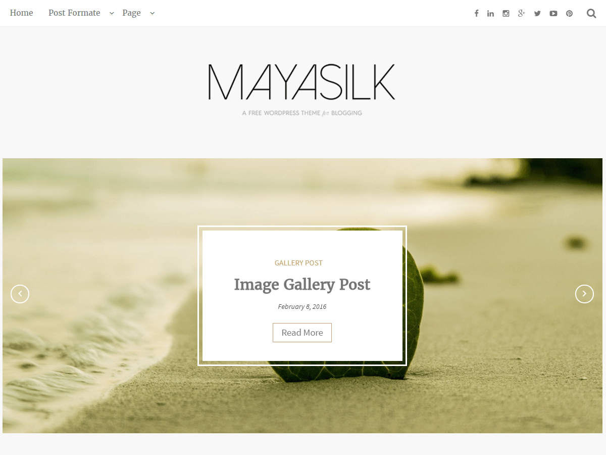 Mayasilk is a fully responsive WordPress theme that looks great on any device. Features include a Full Width Page template, an optional display font, styling for post formats on both index and single views, and an optional no-sidebar page template. Make it yours with a custom menu, logo, Color Scheme, Sticky Post.