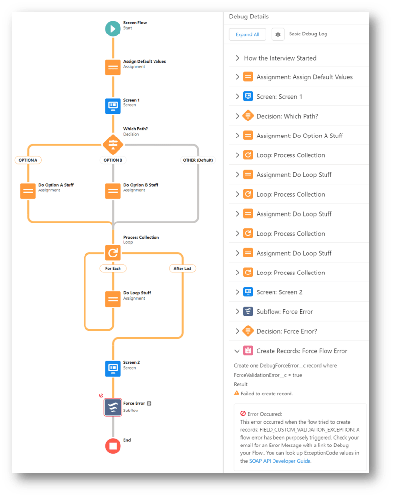 The primary flow gets some Account records and displays them in a Datatable. When the user clicks on a Row Action, the Flow Launcher reacts and calls a Screen Flow and passes the actioned record to it. When the called flow passes back the changed record, the Auto Navigate component’s conditional visibility causes it to navigate to the next element in the flow. The next element in the flow updates the changed Account record and the flow restarts which gets the newly updated Account records and starts the process over again.