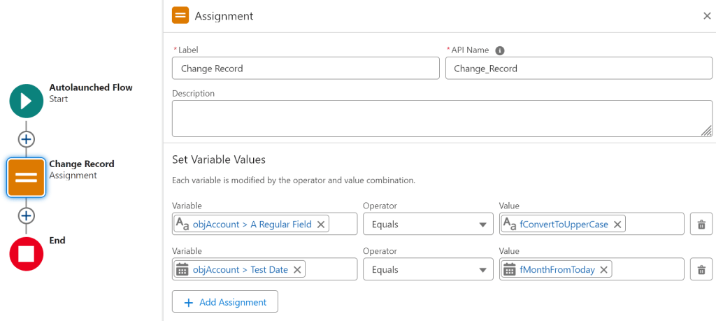 The Assignment sets the field values in an Account record variable.