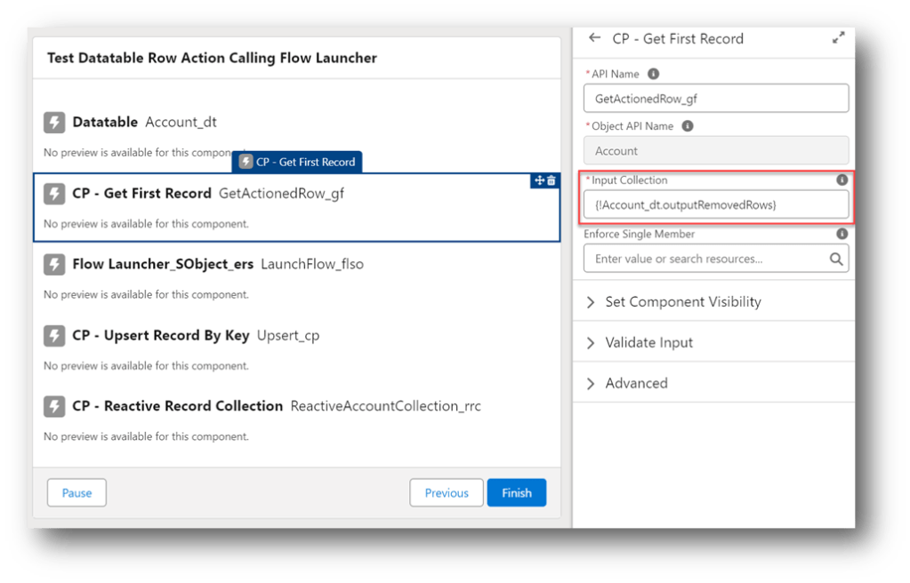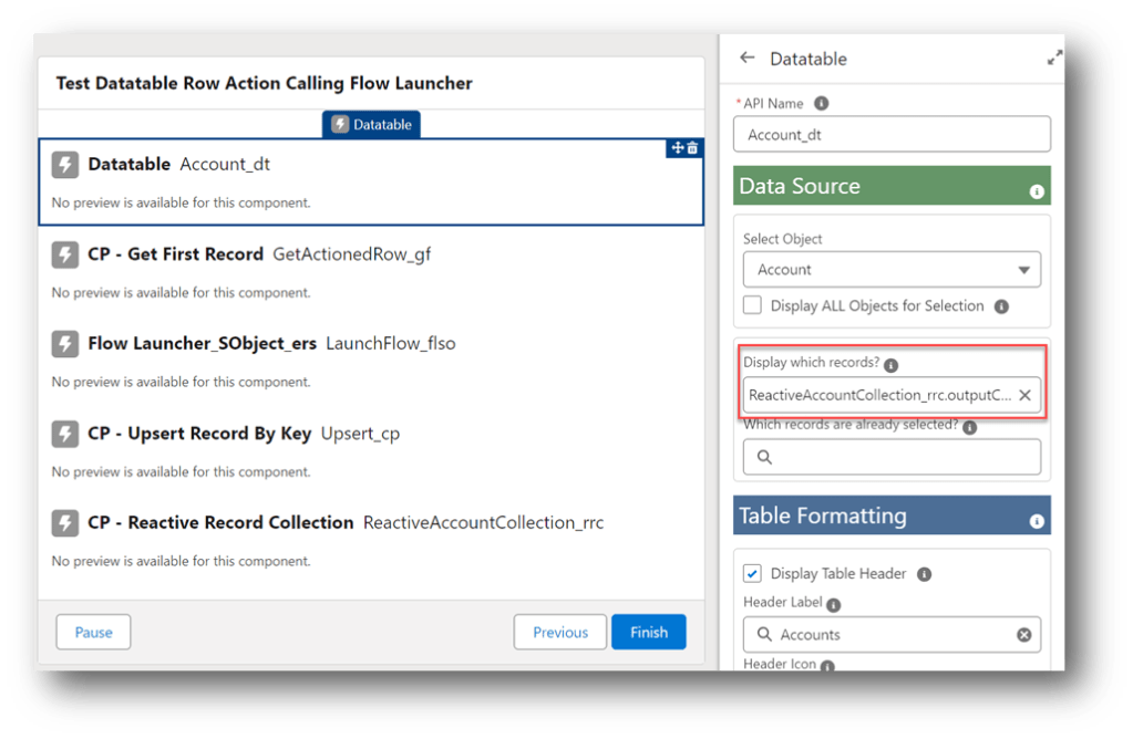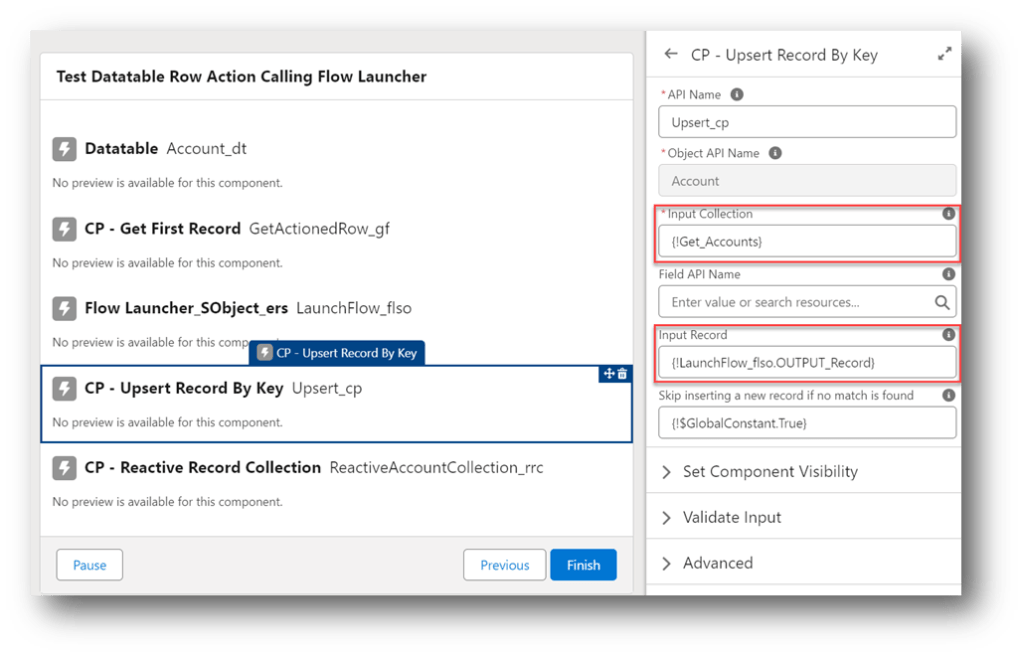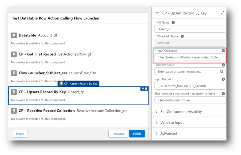 The CP – Reactive Record Collection acts like the BLANKVALUE function for record collections. Initially, the component is seeded with the record collection from the Get Accounts element but once there is a value being returned by the CP – Upsert Record By Key component, that collection is used instead.