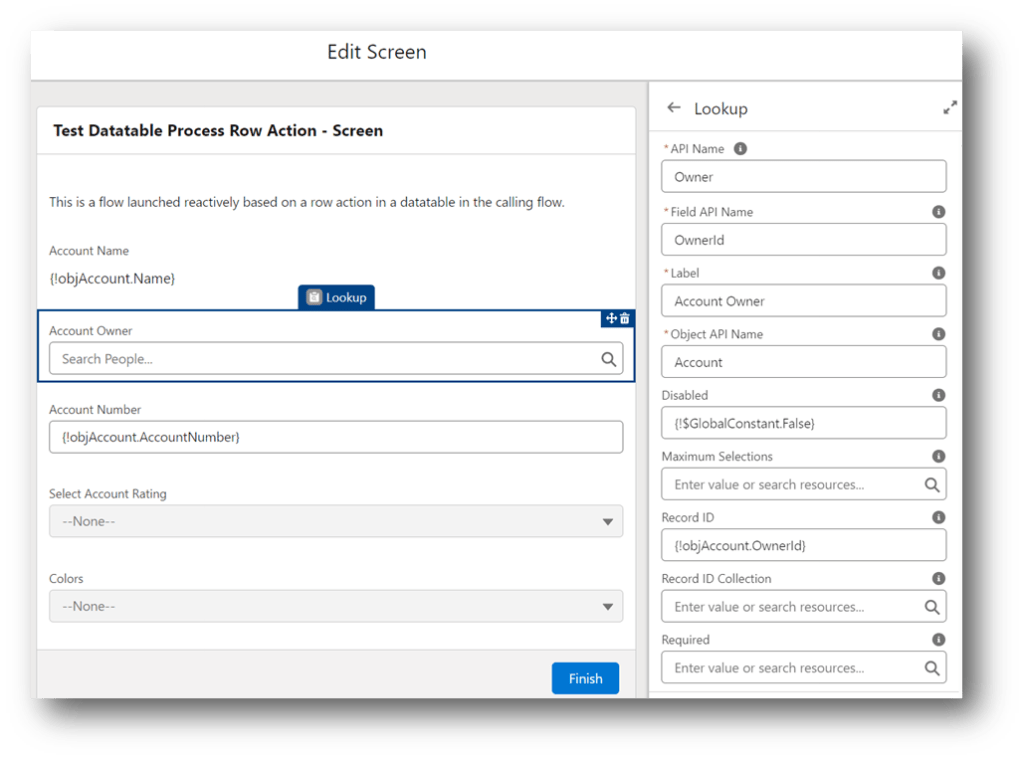 This primary flow is very similar to the flow used in the last example. It has the same Get Accounts and Update Changed Records elements as well as the same custom components on the Screen. The difference is how the Datatable and Flow Launcher are configured.
