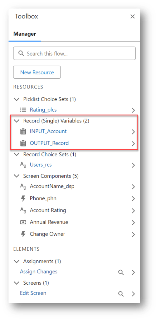 This flow has 2 special resource variables to communicate with the primary flow. One is an Account record variable (INPUT_Account) that is set as “Available for input” and the other is an Account record variable (OUTPUT_Record) that is set as “Available for output”.