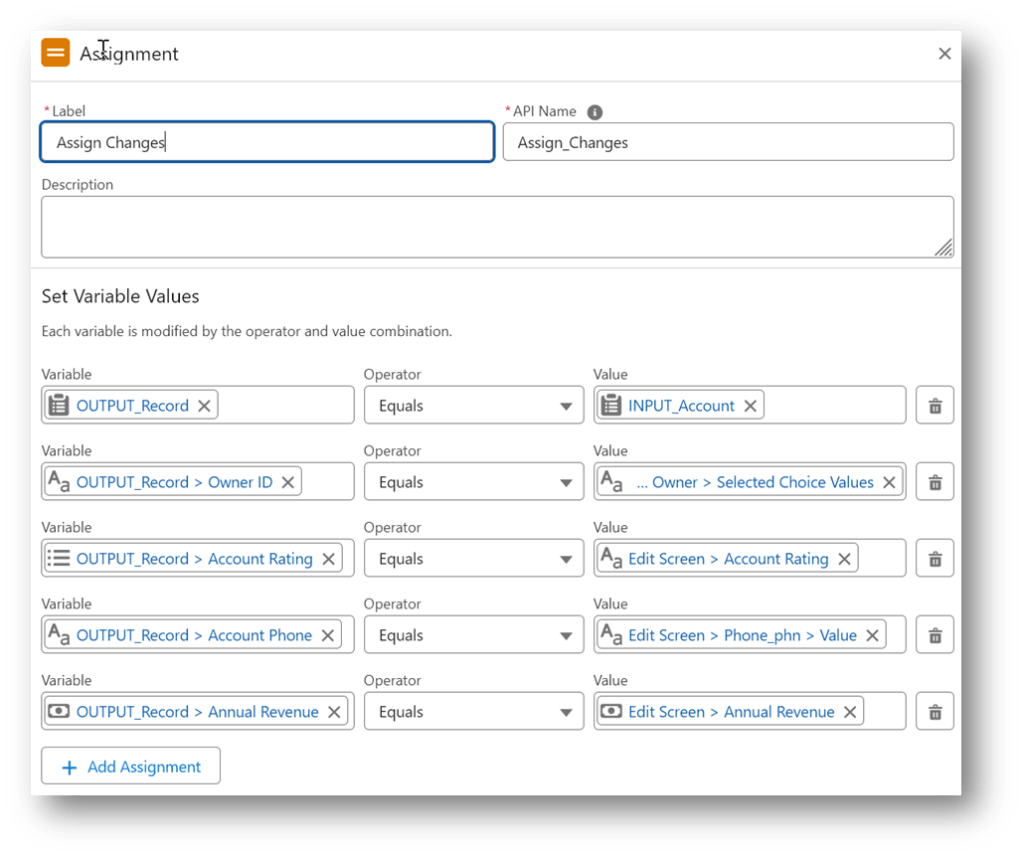 The Assignment copies the original input record to the output record and then updates the field values changed on the screen.