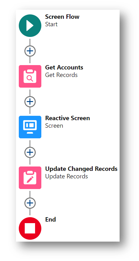 The previous flow processed one record at a time then restarted the flow to display the updated record in the datatable. This slightly different version of the primary flow uses a couple of reactive collection actions to allow multiple updates on the same screen with the records displayed in the datatable refreshing each time a change is saved. This type of flow is useful when you want to handle record updates as part of a larger flow or process.
