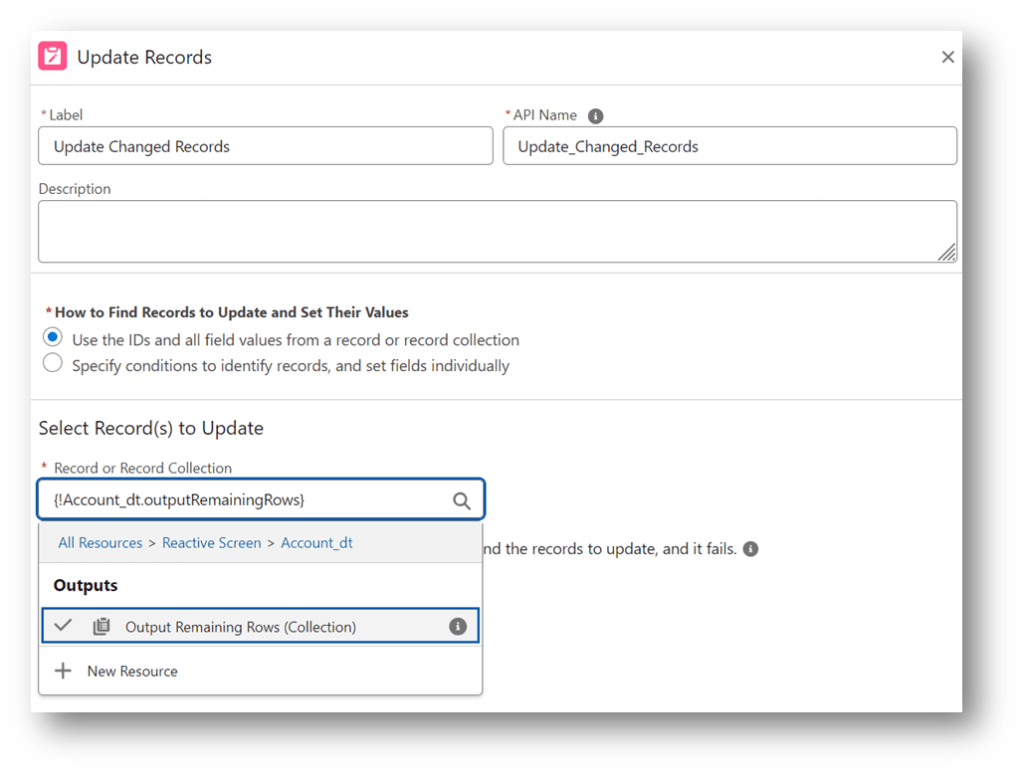 - The API name of the field used to match the record in the collection can be left blank as it defaults to Id.