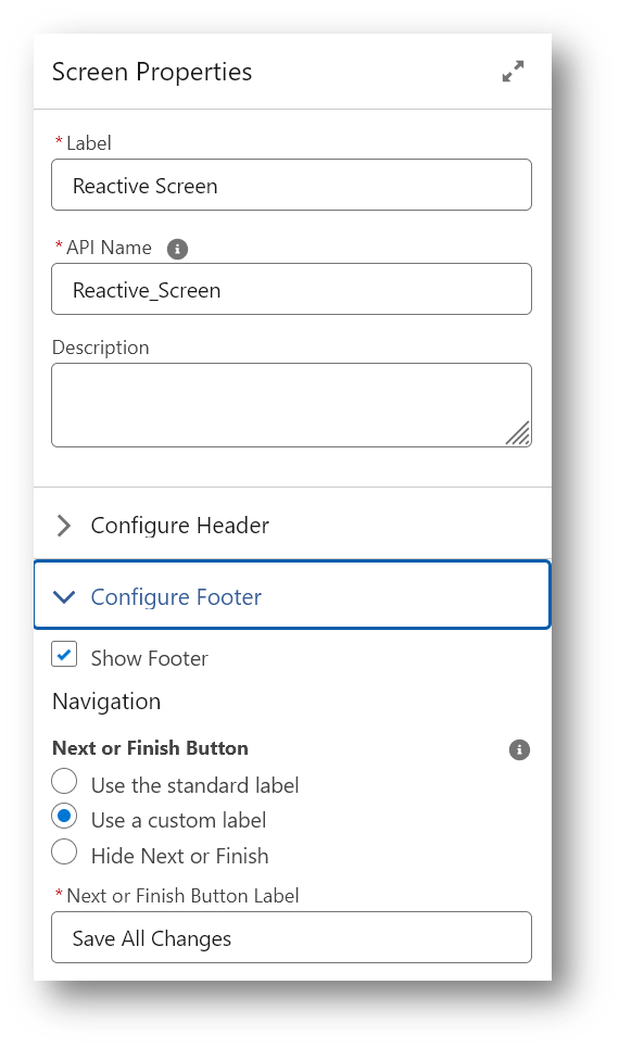 NOTE: To help your future self when going back later to review a flow with a lot of custom screen actions, you can use Display Text components (7) on the screen to add descriptive notes.