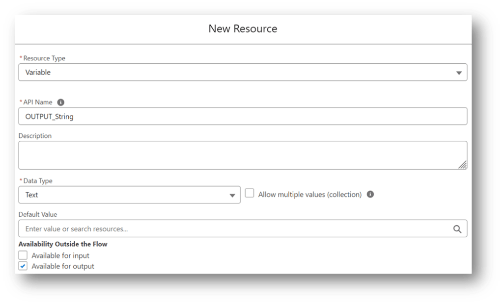 NOTE: The output variable has to have this exact name in order to be recognized by the Flow Launcher component in the primary flow. The input variable can have any name as long as the primary flow references the same name in the Flow Launcher configuration.