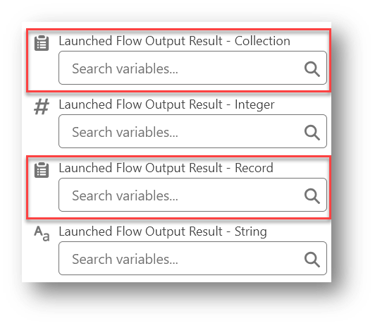 This version of the component will also recognize Launched Flow Output Result – Collection (OUTPUT_Collection) and/or Launched Flow Output Result – Record (OUTPUT_Record). These allow you to pass a collection of records or a single record of the specified Object back to the calling flow.