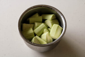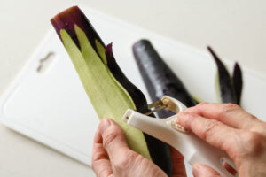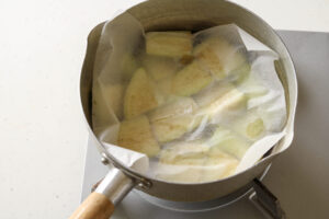 今回はなすは皮をむき、やわらかく仕上げます。だし汁がしみやすくふわっとした味わいになります。