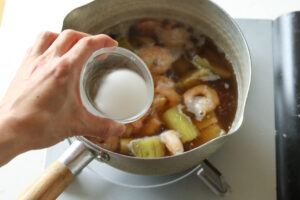 B【片栗粉 小さじ1、水 小さじ2】を混ぜ合わせた水溶き片栗粉を加え、とろみをつける。