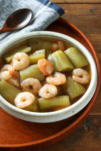 茄子とえびをあっさりとだし汁で煮て、ゆるくとろみをつけます。