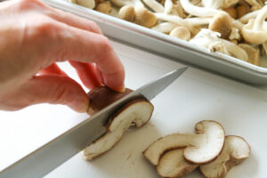 しいたけは石づきを落として、軸をつけたまま薄切りにする。