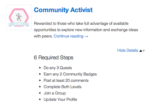 - Simple interface for defining the “Required Steps” for any badge or achievement seamlessly integrates community actions