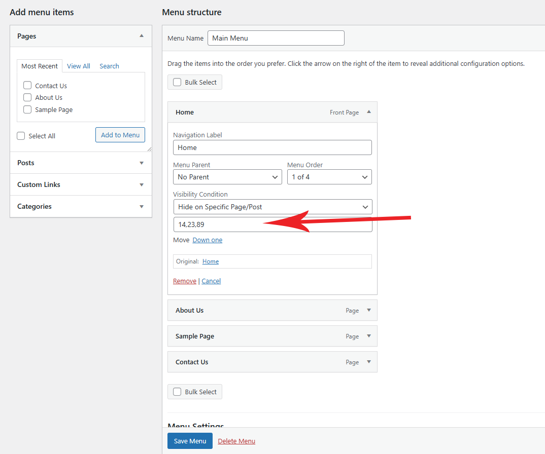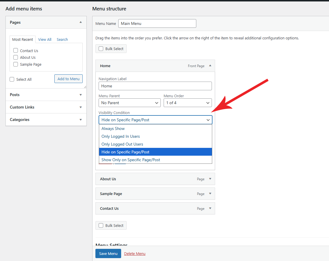 - Go to Appearance Menus and configure visibility options under each menu.